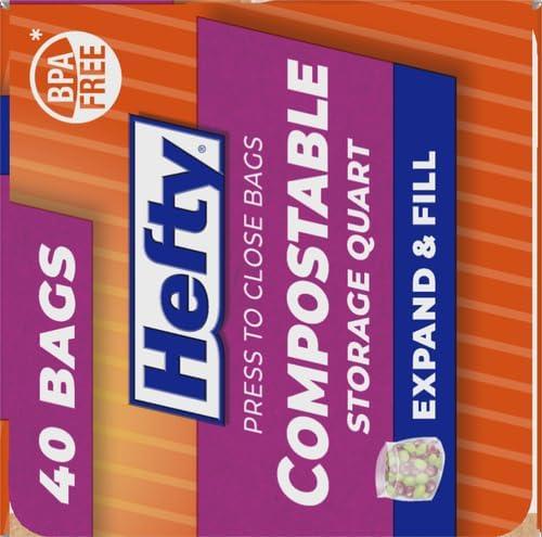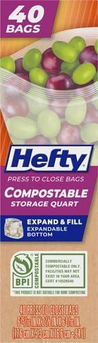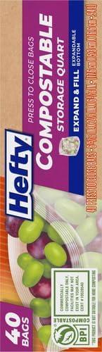 COMPOSTABLE QUART SIZE BAGS—This pack includes 40 quart size BPA-free Hefty Compostable Press to Close Food Storage Bags