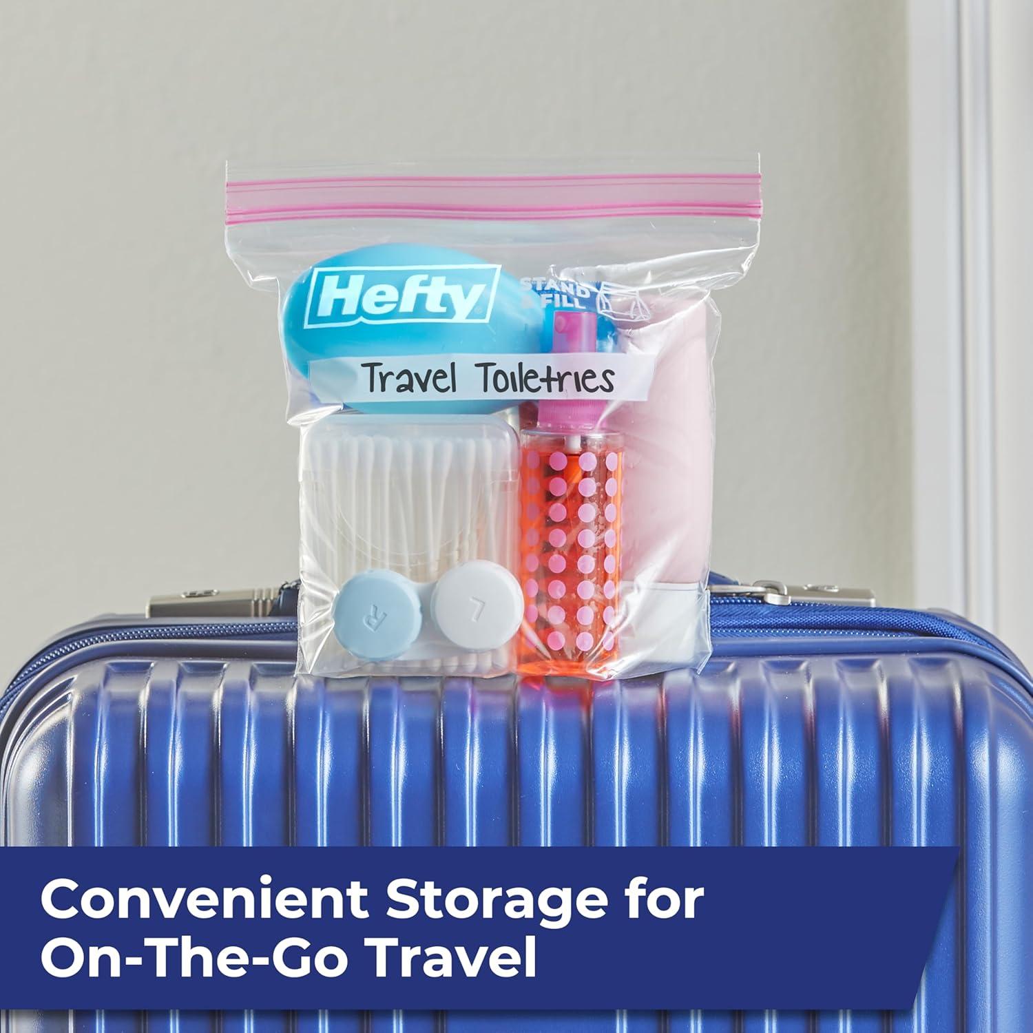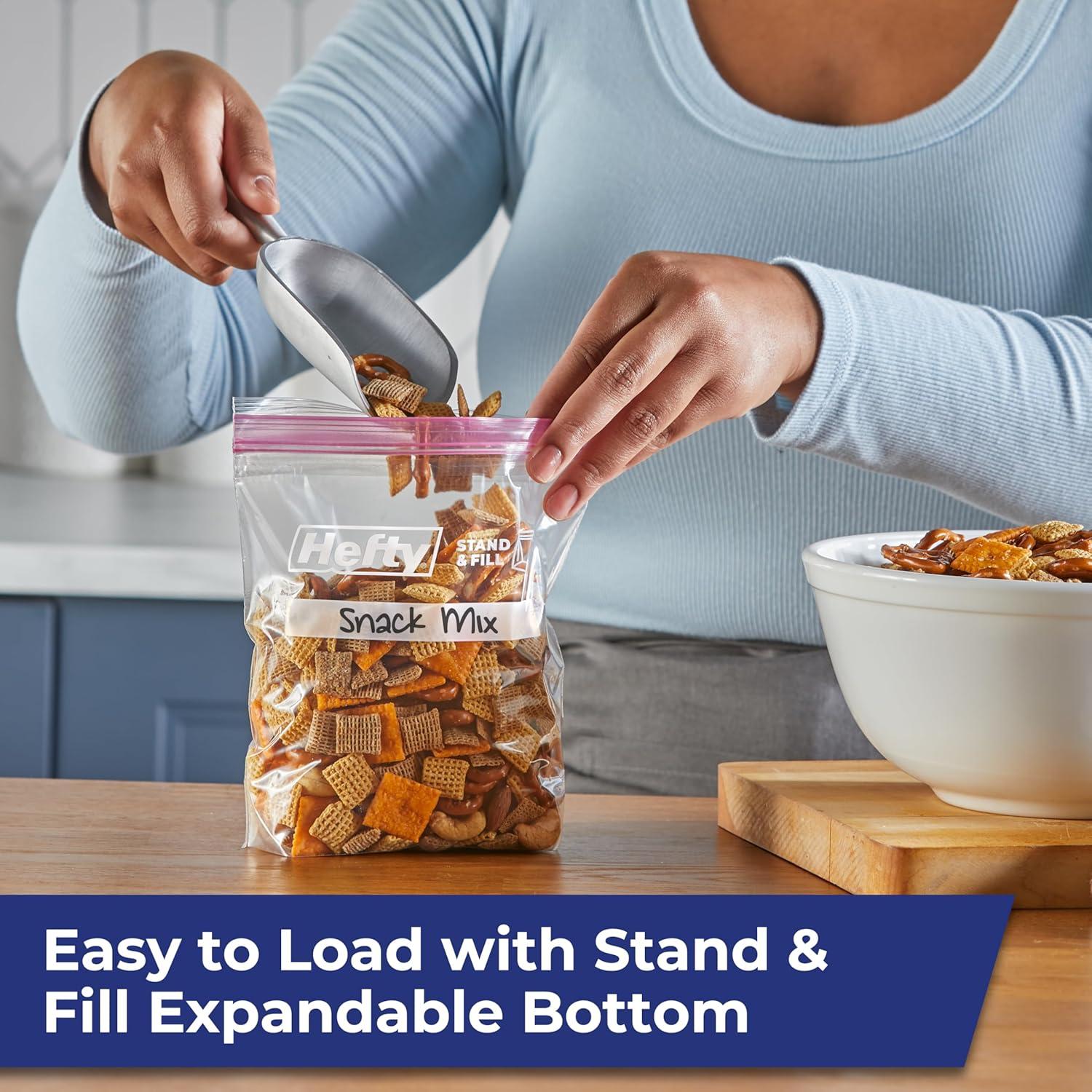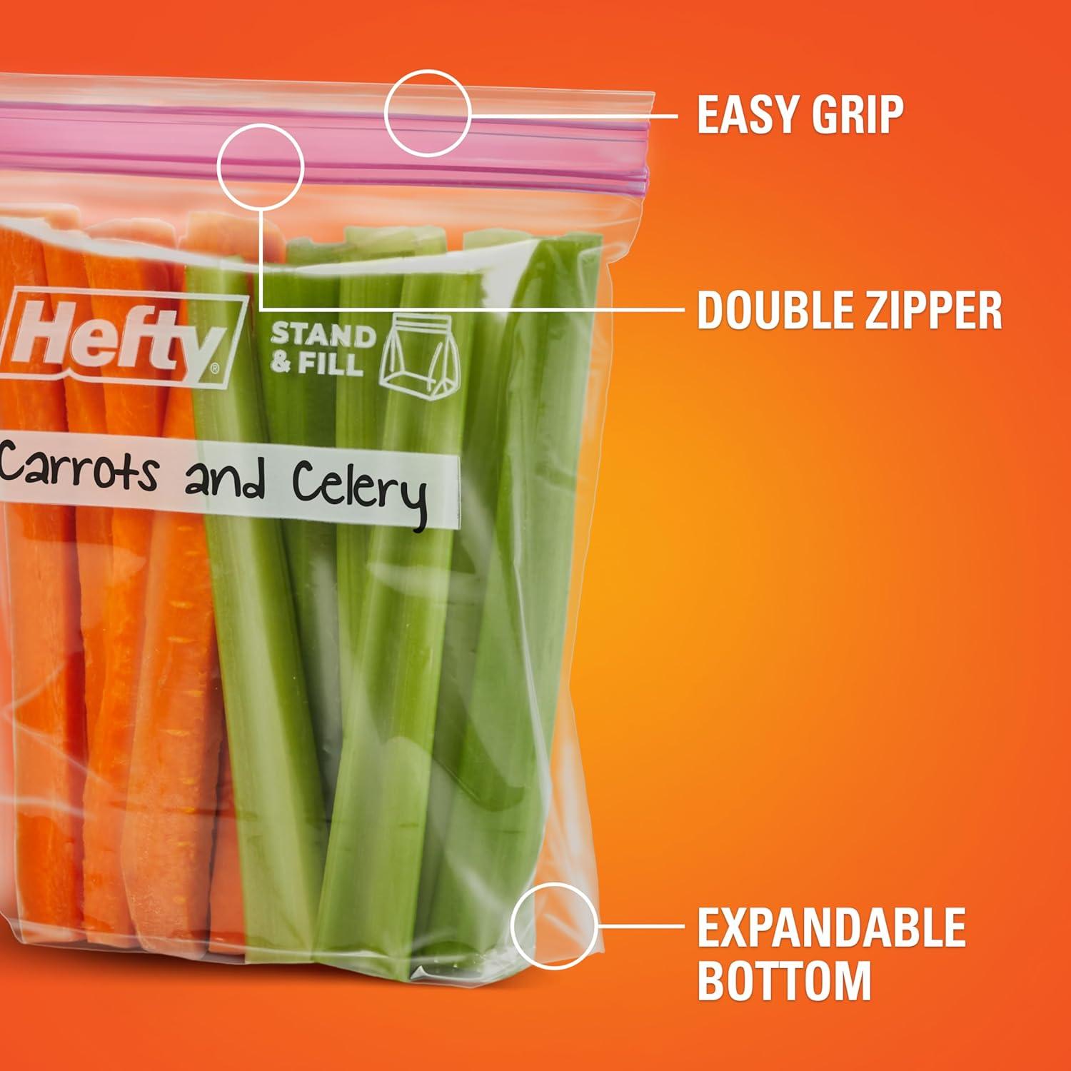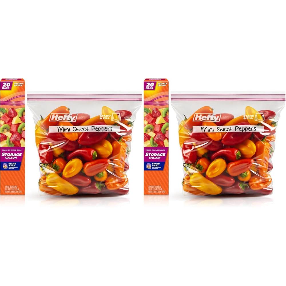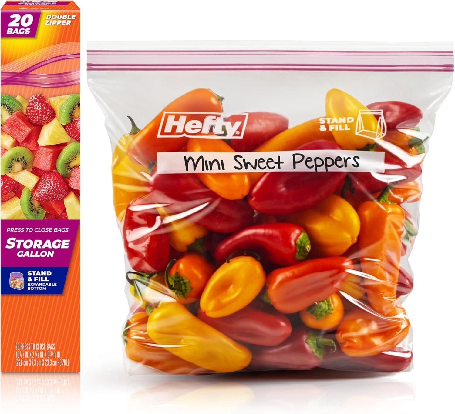 Introducing Hefty Press to Close Storage Bags, our first-ever press to close design for packing and storing leftovers and more! The stand-and-fill expandable bottom on these gallon bags make it easy to load food, craft supplies, or other household items into these BPA-free plastic bags for food storage. The easy grip, double zipper closure creates a secure seal that snaps closed with just a press. These plastic food bags are microwave safe for even more convenience. Take these gallon bags out of the kitchen and on the go to keep clothes clean and wrinkle free in suitcases or keep camping supplies protected from mess. When you’re done, you can recycle Hefty brand food bags when clean and dry at participating retailers in the United States. And don’t forget: all Hefty products come with a 100% satisfaction guarantee.