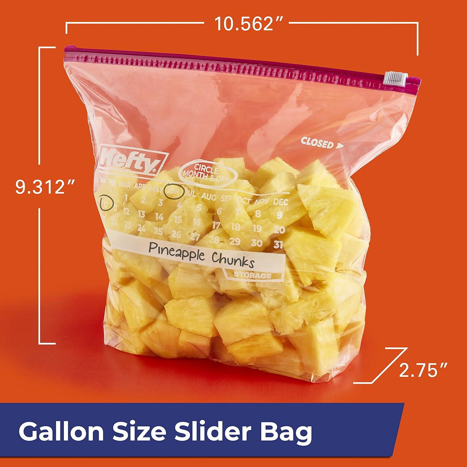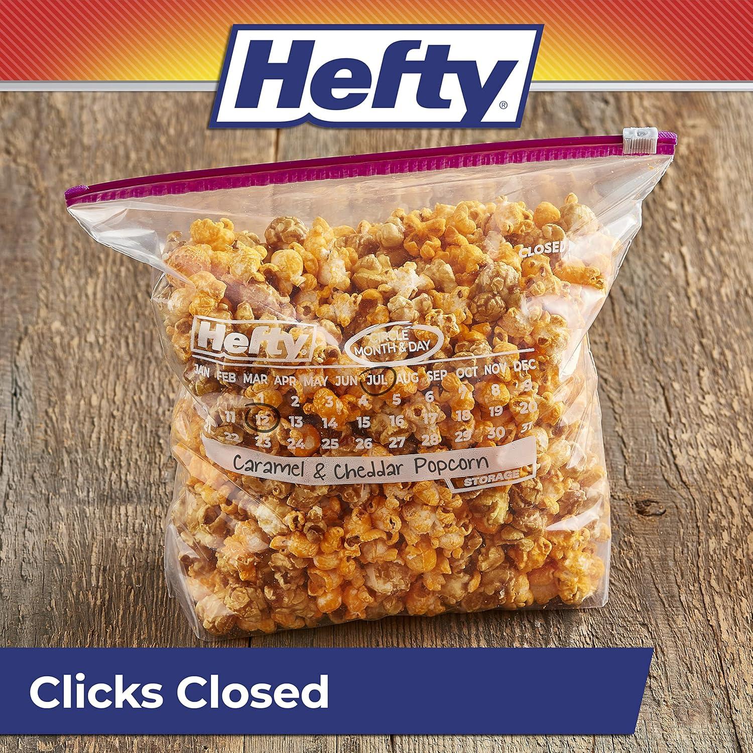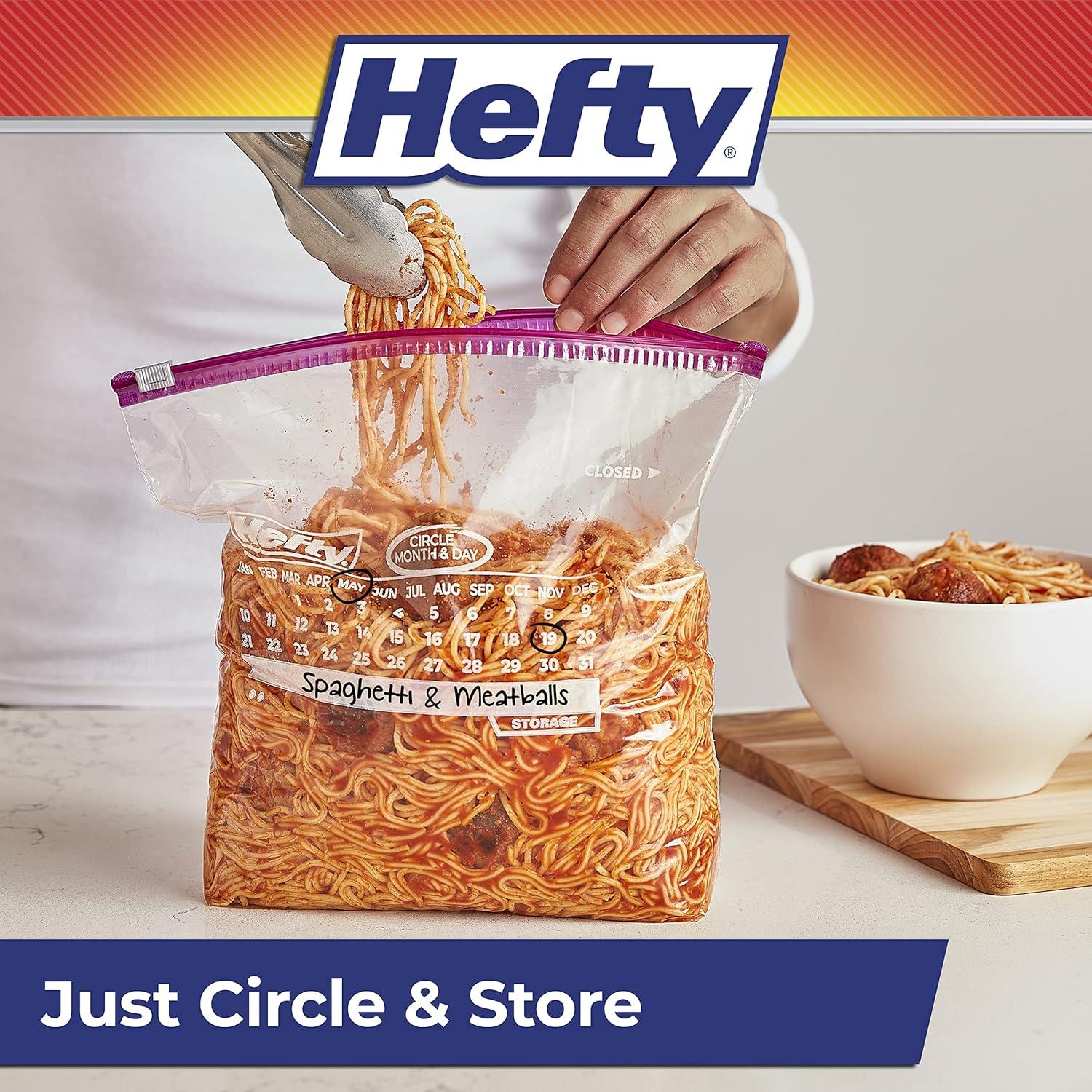 Hefty Slider Calendar Bags provide a simple strategy for solving the mystery of what you’ve stored and for how long. Simply use the large write-on labels on these storage bags to label the contents, circle the month and date on the printed-on calendar, and store away! No more guesswork. The patented, easy-to-use MaxLock track and Clicks-Closed feature lets you know when these BPA-free plastic bags for food storage are securely closed. Plus, the stand-and-fill expandable bottom makes it easy to load leftovers, meal prep, trail mix, crackers, and more into these plastic food bags with ease. The easy-to-use slider will keep everything sealed and fresh until you’re ready to enjoy. Hefty's premium quality and super strength come with superior savings and a 100% satisfaction guarantee.