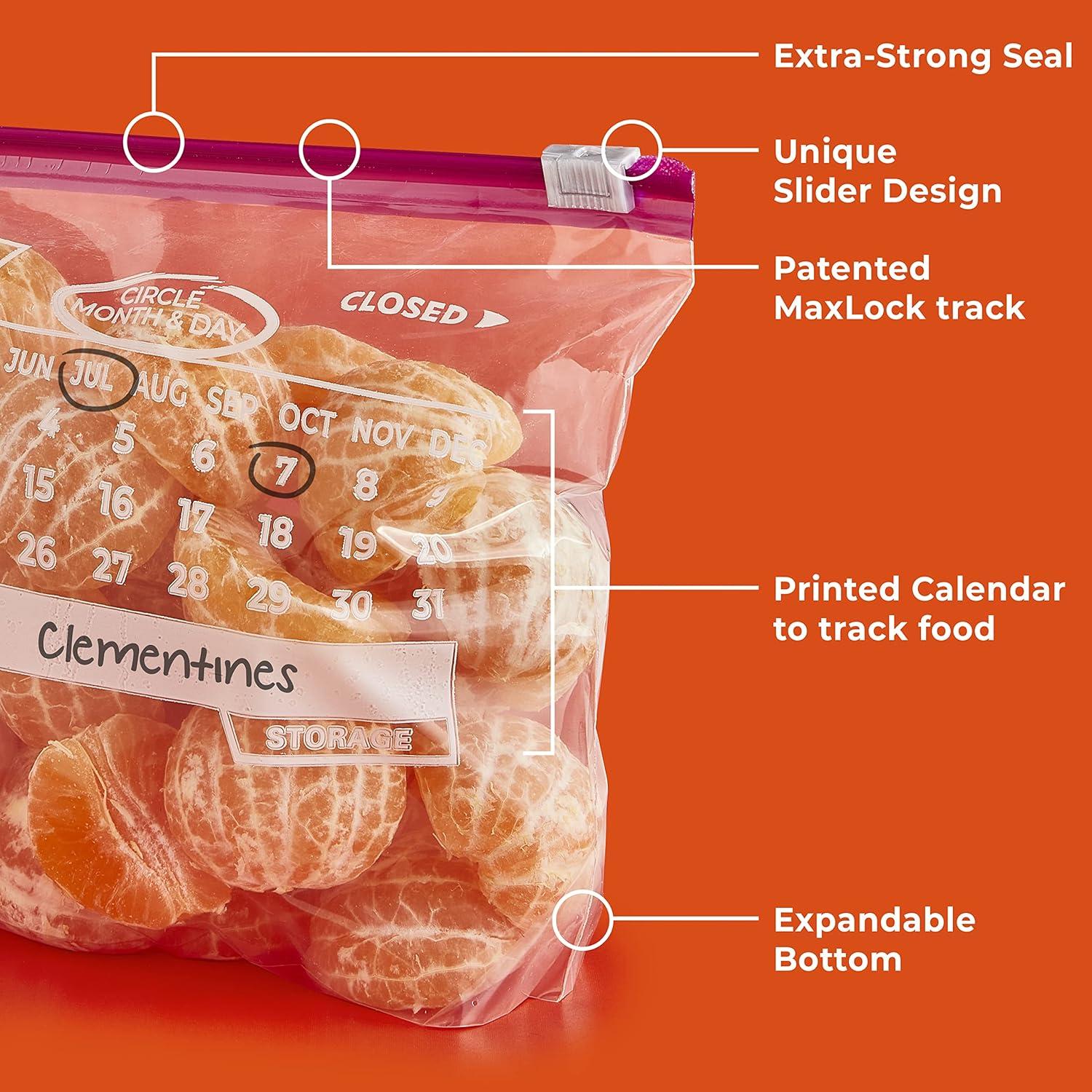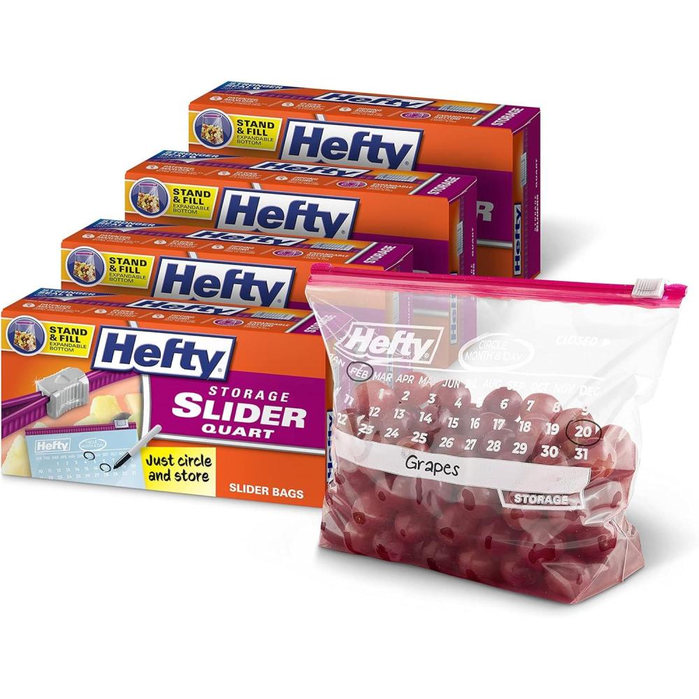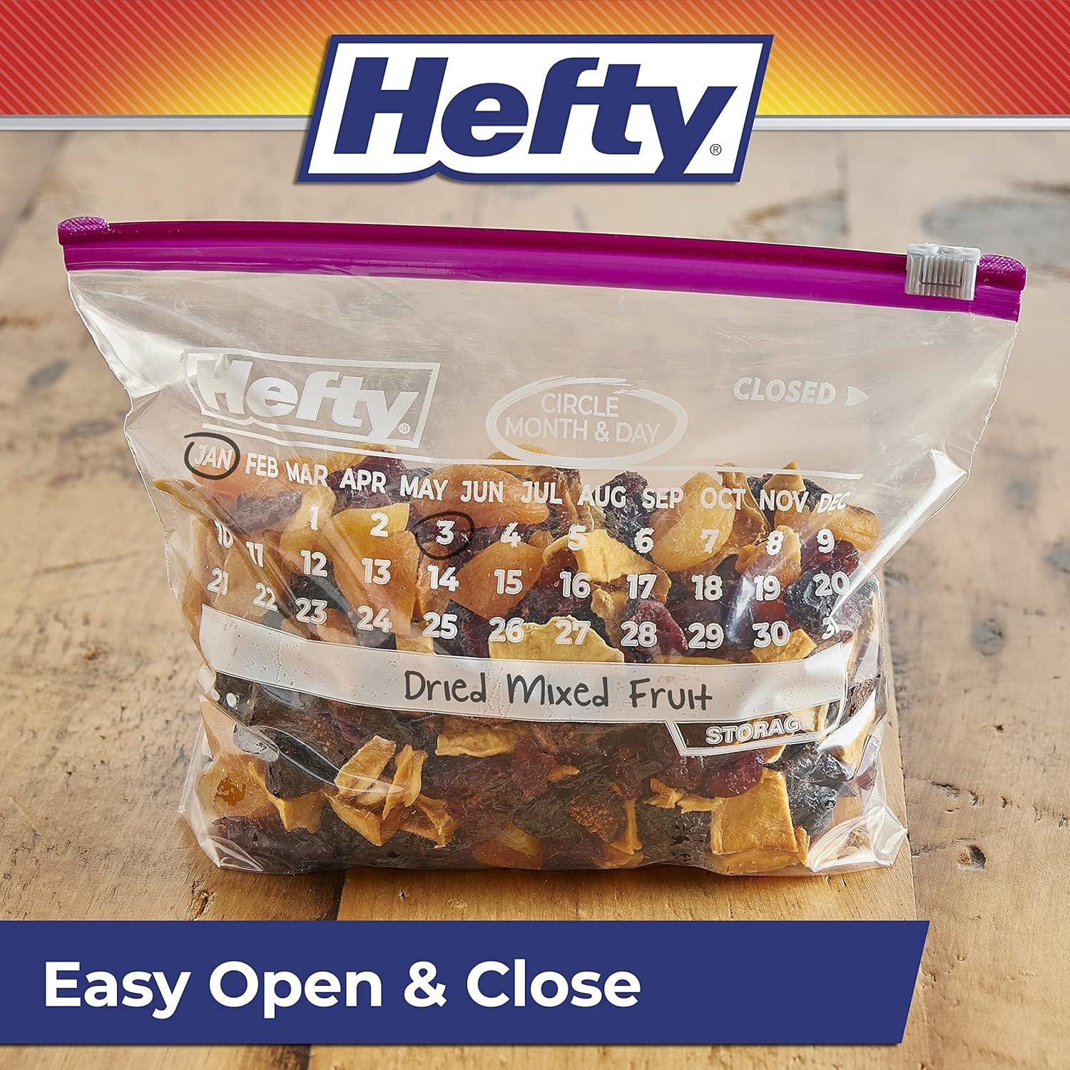Hefty Slider Calendar Bags provide a simple strategy for solving the mystery of what you’ve stored and for how long. Simply use the large write-on labels on these storage bags to label the contents, circle the month and date on the printed-on calendar, and store away! No more guesswork. The patented, easy-to-use MaxLock track and Clicks-Closed feature lets you know when these BPA-free plastic bags for food storage are securely closed. Plus, the stand-and-fill expandable bottom makes it easy to load leftovers, meal prep, trail mix, crackers, and more into these plastic food bags with ease. The easy-to-use slider will keep everything sealed and fresh until you’re ready to enjoy. Hefty's premium quality and super strength come with superior savings and a 100% satisfaction guarantee.