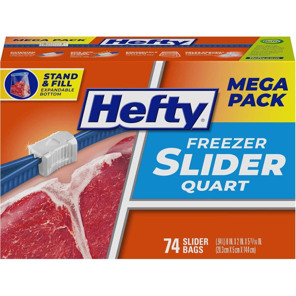 Portion bulk foods for freezer storage, or package treats and leftovers for friends and family with gallon size Hefty Slider Freezer Bags. The thicker plastic and extra-strong seal helps keep food fresh and protected from freezer burn. The patented MaxLock track and Clicks-Closed feature lets you know when these BPA-free plastic freezer bags are securely closed. The stand-and-fill expandable bottom makes it easy to load food, craft supplies or other household items into these storage bags. Large write-on labels let you identify and organize the contents of each of these slider bags in your fridge, freezer or closet. Take these Hefty freezer bags with you on-the-go, too! Keep clothes fresh and wrinkle free in suitcases or keep camping supplies protected from mess. Don’t forget; Hefty's premium quality and super strength come with superior savings and a 100% satisfaction guarantee.