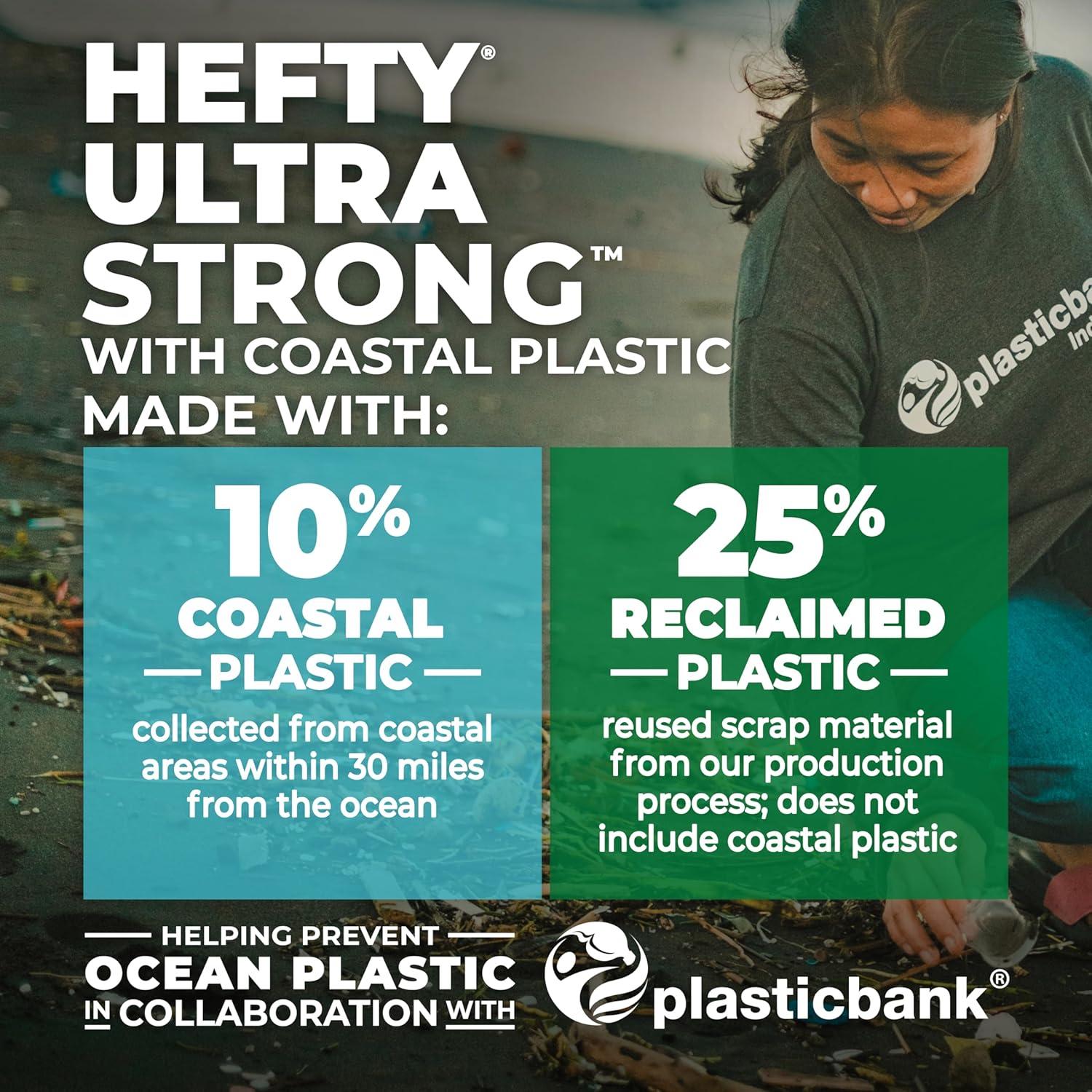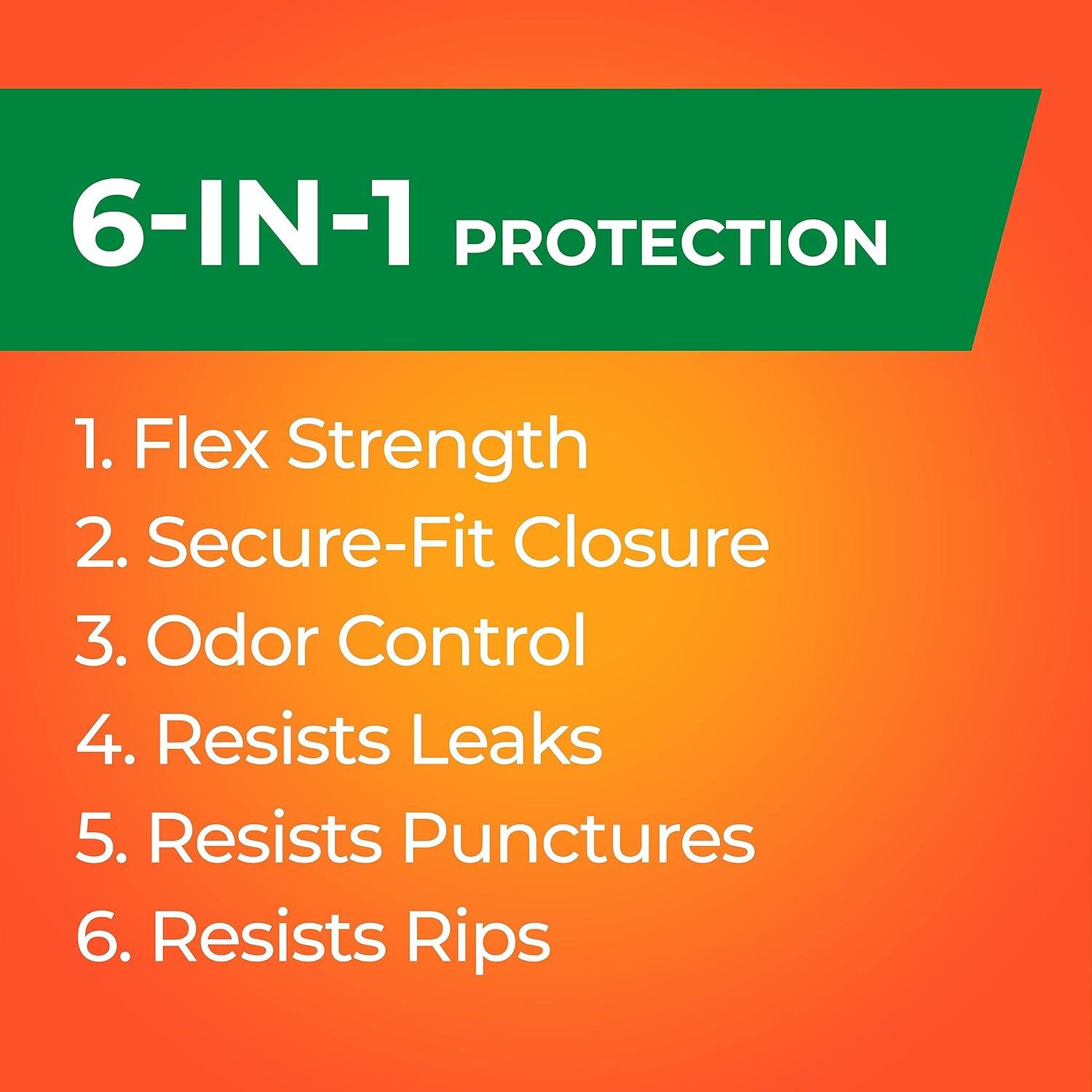 Trust Hefty Ultra Strong 13 Gallon Trash Bags to keep your kitchen waste contained and out of sight—from the can to the curb. The black color hides unsightly messes, which means these innovative kitchen garbage bags will keep your garbage in the dark. Thanks to Triple Action Technology, these tough Hefty kitchen trash bags resist punctures, leaks, and tears. The result is the highest protection you can get in flexible 13 gallon trash bags. Hefty’s stretchy strength means you don't have to worry about unexpected bag breakage and inconvenient messes when you use these tall kitchen garbage bags. Don’t be afraid to use these kitchen trash bags for tougher jobs, such as garage, basement and construction cleanup. A break-resistant grip drawstring makes it easy to close the bag and cart it away without incident. As a bonus, these scented trash bags include Arm & Hammer odor control technology and a Clean Burst scent to keep unpleasant smells at bay and keep your kitchen smelling fresh and clean. All Hefty trash bags are backed by a 100% Satisfaction Guarantee. *The ARM & HAMMER trademark is owned by Church & Dwight Co., Inc., and used by Reynolds Consumer Products LLC under license.