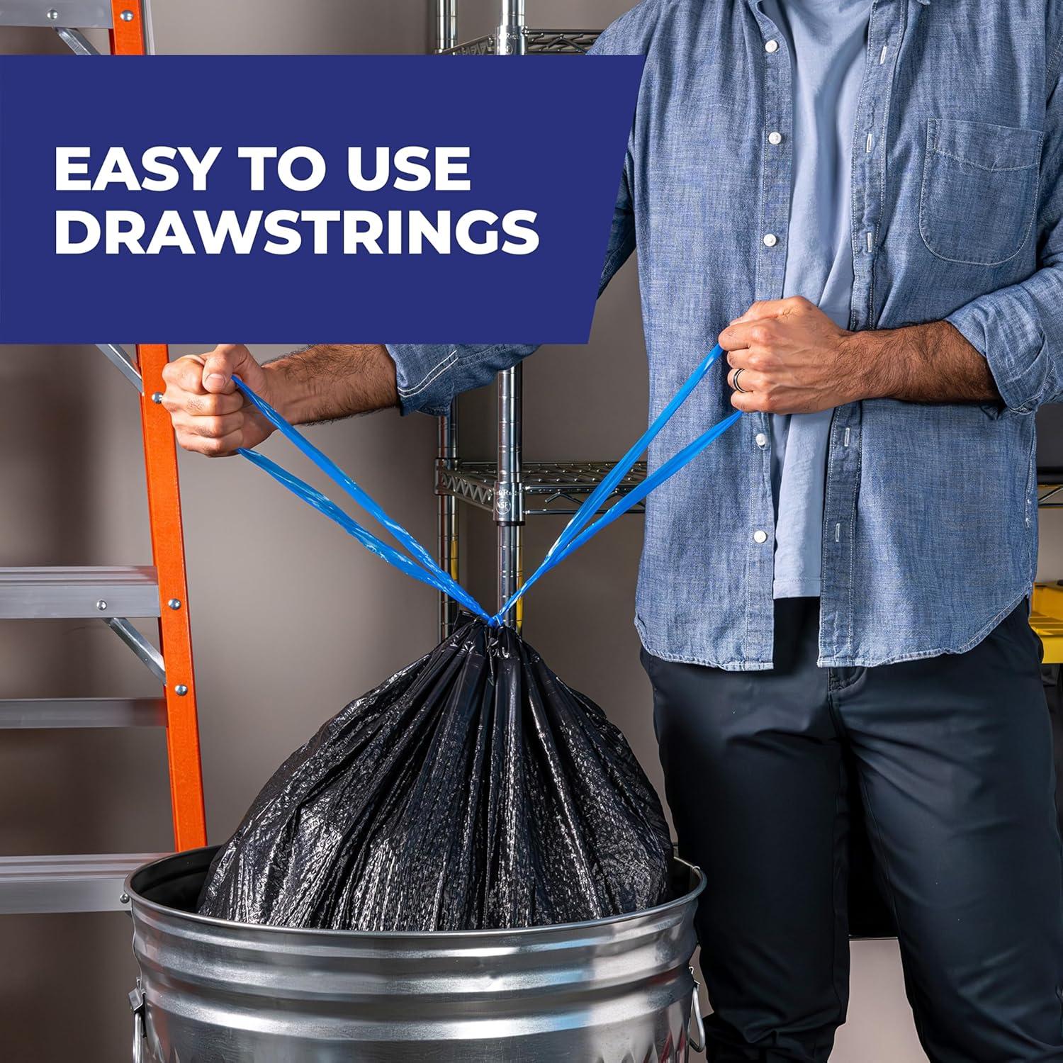 Dependable Drawstring Closure: The durable drawstring on these black garbage bags 30 gallon makes it easy to transport heavy loads, donations, seasonal items and more