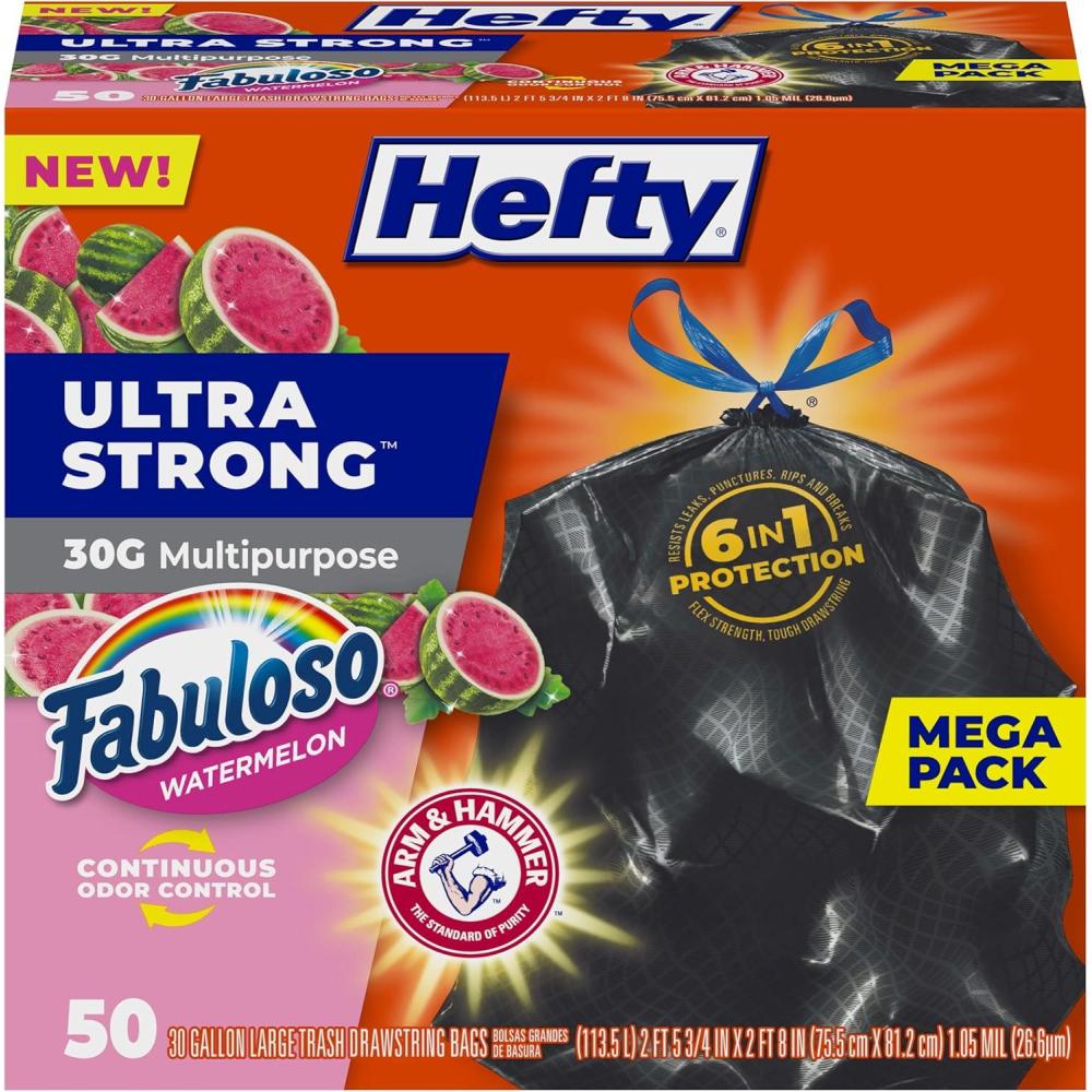Hefty Ultra Strong 30 Gallon Trash Bags, Large Trash Bags, Multipurpose, Break Resistant Drawstring Closure, Resists Leaks, Punctures, and Tears, Black, Fabuloso Watermelon Scent, 50 Bags(50 Count (Pack of 1))